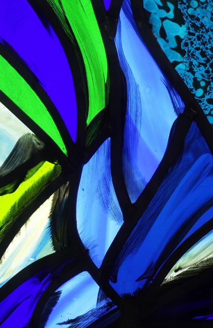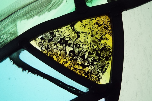 The design is based on one of the tree forms towards the right-hand side of the old window. The theme is the cycle of life: cell division and new life; hopeful green shoots; healthy leaves of memory; mature, permanent branches; loss and decay. Using a similar colour palette and traditional stained glass techniques anchors the memory of the old window in the new.