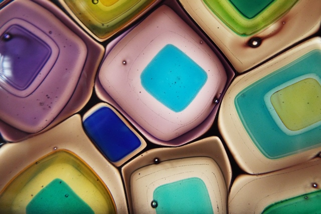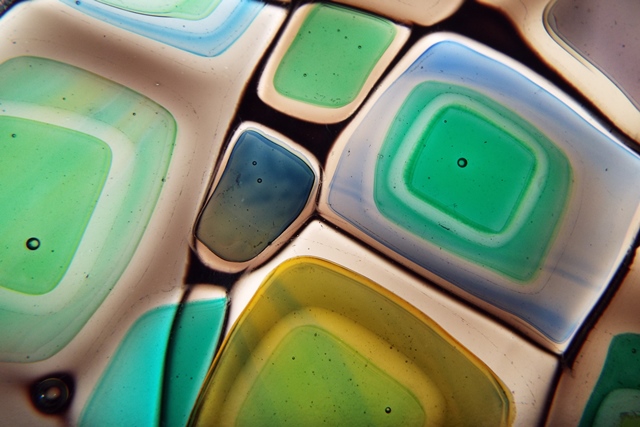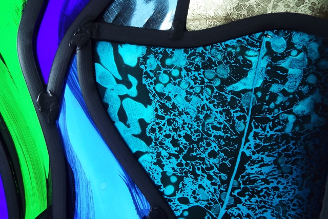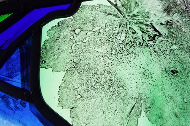 Interesting details and textures are used to invite children and adults alike to look deeper. Smooth fused glass elements represent cells dividing. Intricate patterns are made by sandblasting real leaves, where the original leaf leaves its mark on the glass but is destroyed in the process. In painting the window, foliage and other items are used to print onto the glass. Whether people pass by or pause for a closer look, reflections from mirror and lustre glimmer.